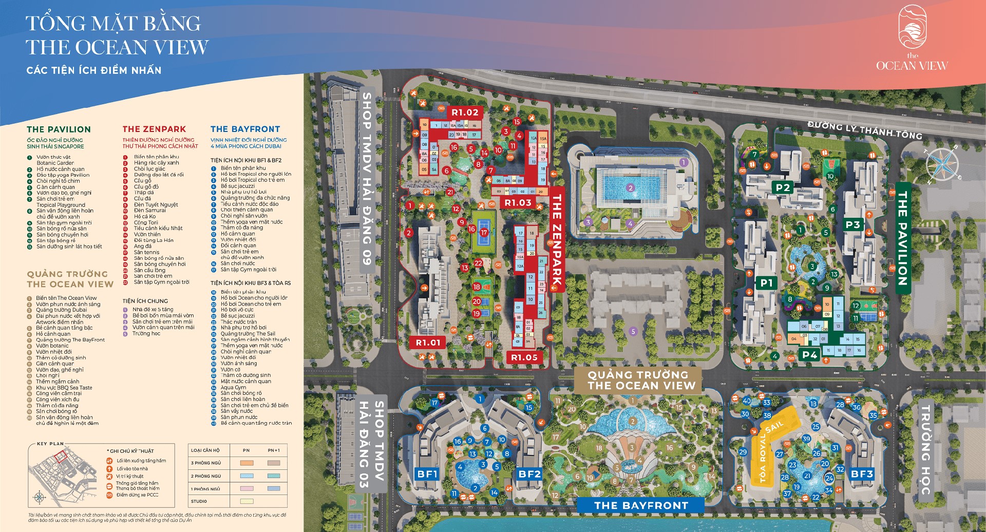 • The Zenpark: 4 tòa căn hộ cao cấp phong cách Nhật Bản, đánh số từ R1.01 đến R1.05.